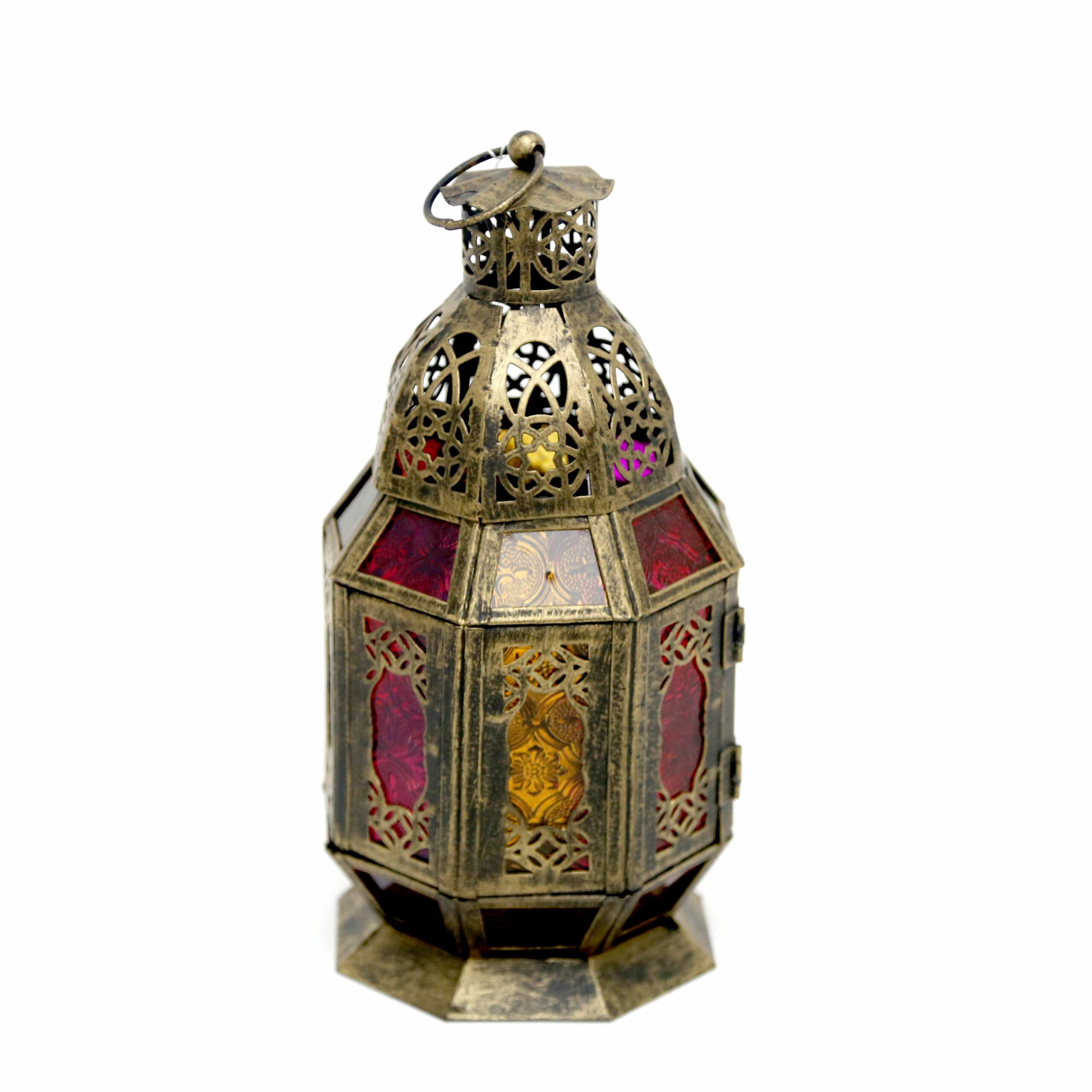 The lantern’s design draws inspiration from classic Arabic architecture, with ornate filigree patterns and an exotic silhouette that adds a touch of opulence to your festive decorations. Each panel is carefully set with colored glass in shades of red, yellow, and purple, reflecting the rich colors traditionally associated with Ramadan celebrations.
